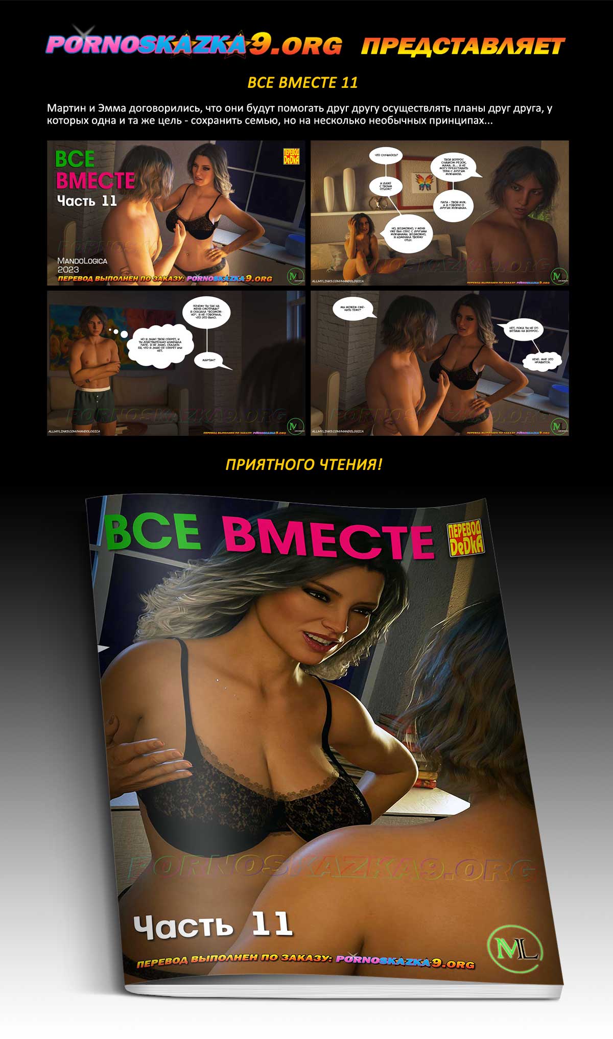 Порно комикс «Все вместе. Часть 11.» Мартин и Эмма договорились, что они будут помогать друг другу осуществлять планы друг друга, у которых одна и та же цель — сохранить семью, но на несколько необычных принципах…